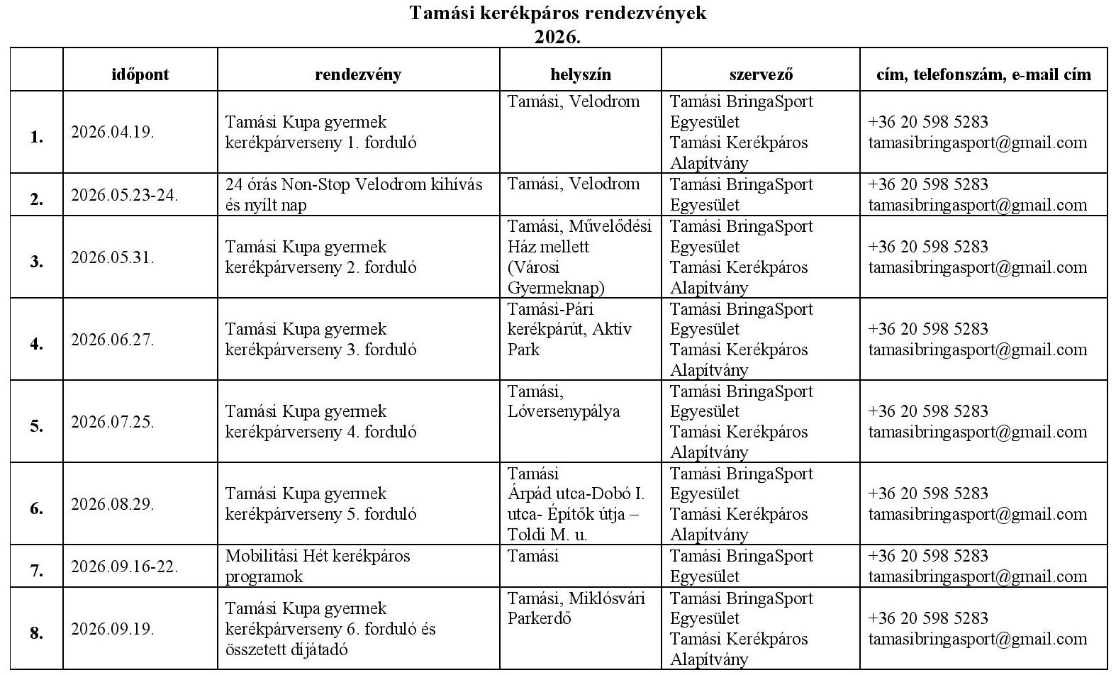 A 2026-os évben is számos kerékpáros esemény várható Tamásiban. A Tamási Kerékpáros Napok rendszeresen megrendezésre kerülő esemény, amely versenyzési lehetőséget biztosít különböző korosztályok számára.